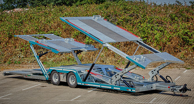 Kässbohrer Transport Technik, VEGA International and VTG are developing and building tailor-made systems for effective and efficient ship and rail transport. The system converts a standard pocket wagon into a car transport wagon. Thanks to the universal applicability of the system, inbound and outbound traffic can for the first time be combined and thus made more efficient in automotive logistics on rail.